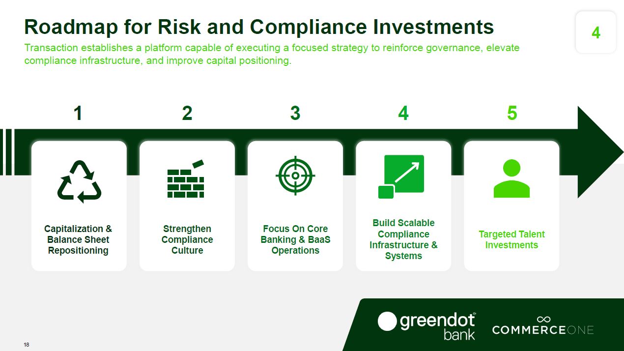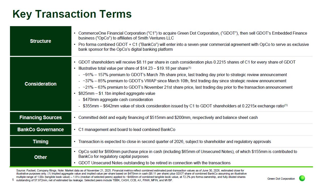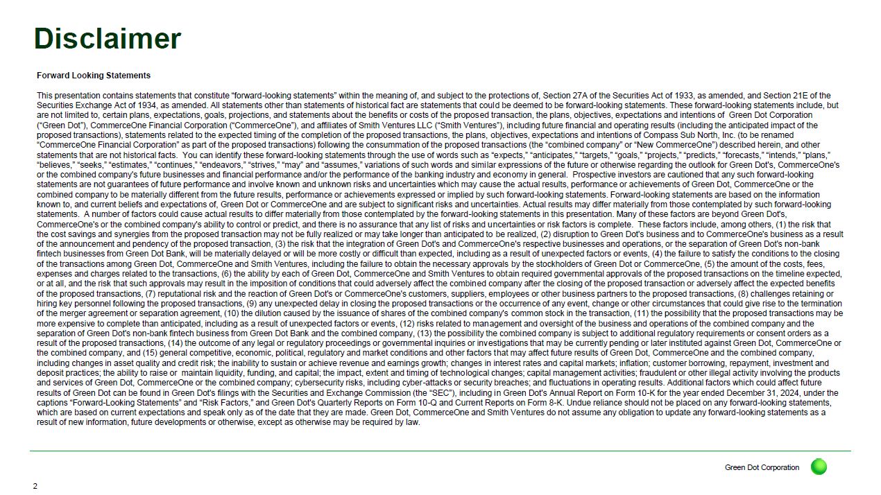 Smith Ventures and CommerceOne Financial Corporation. Smith Ventures will acquire and privatize Green Dot’s non-bank financial technology business assets and operations, which will continue running as an independent and growth-focused fintech and