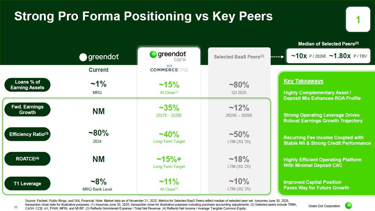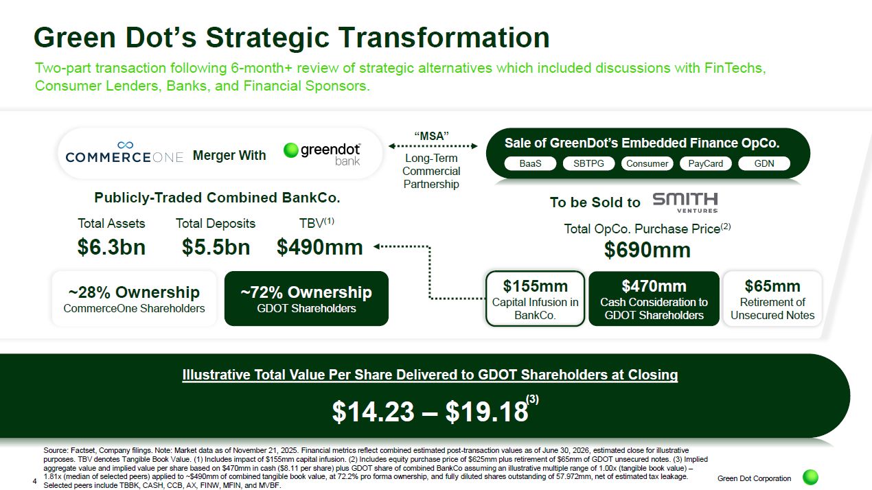 ~$355mm - $642mm in aggregate in stock of CommerceOne issued to Green Dot shareholders based on 0.2215x exchange ratio. Assumes June 30, 2026, transaction close for illustrative purposes. Please refer to the investor presentation materials for