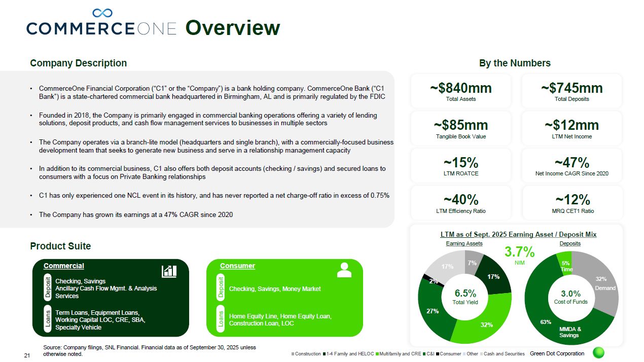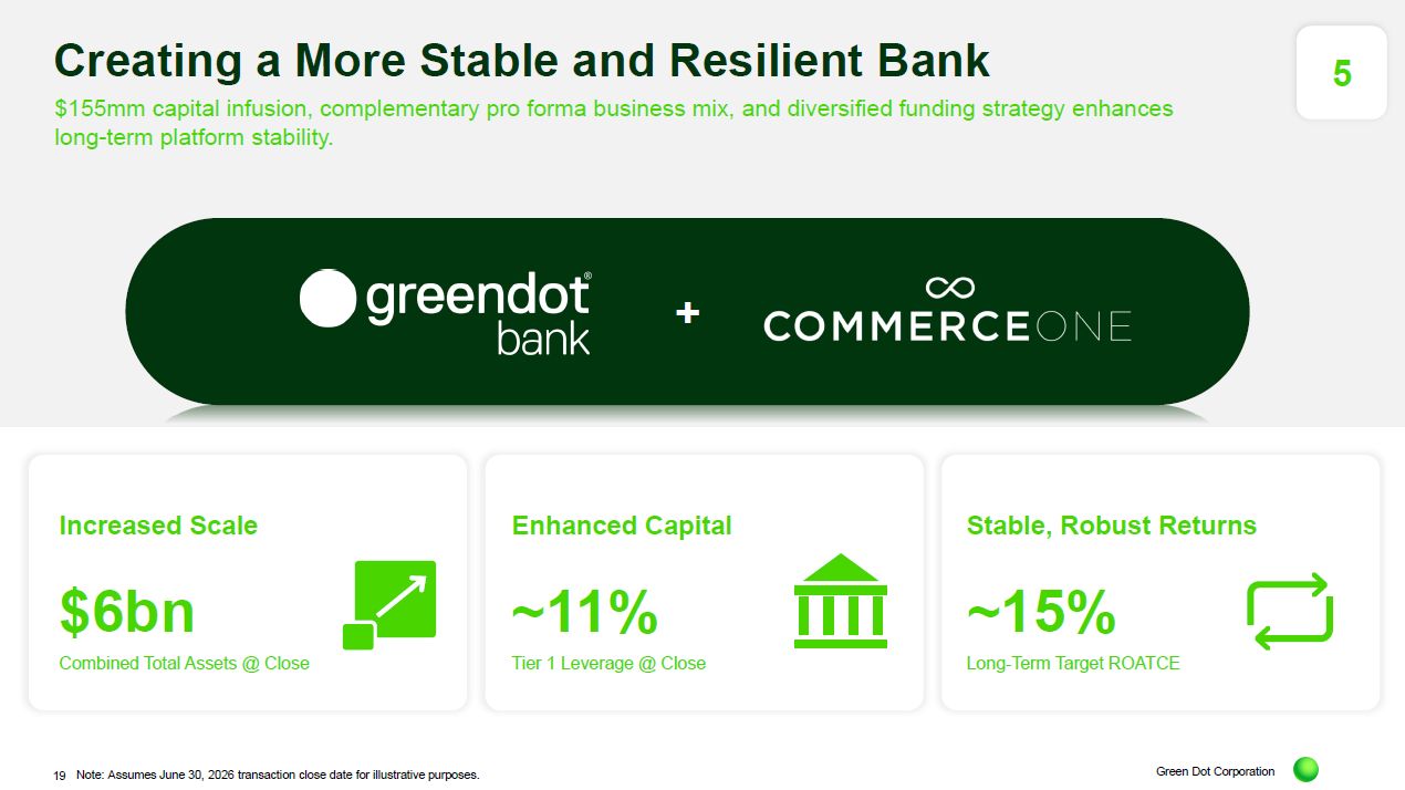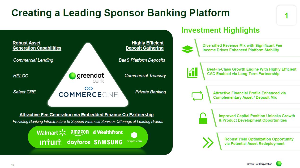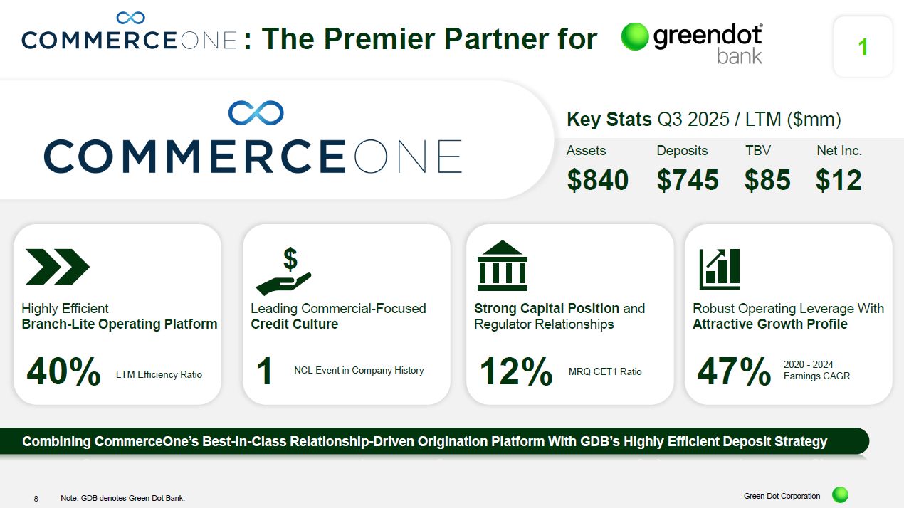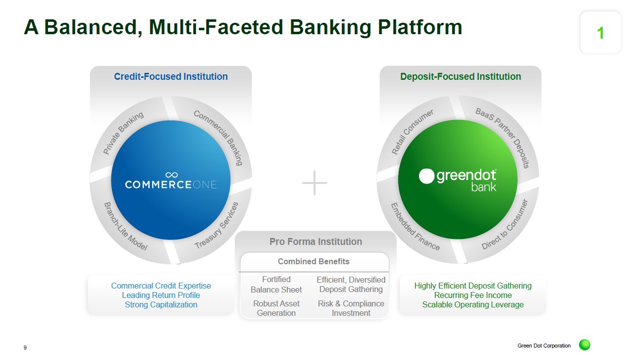 The pairing joins Green Dot Bank’s highly efficient deposit-gathering platform with CommerceOne Bank’s robust asset generation capabilities.
