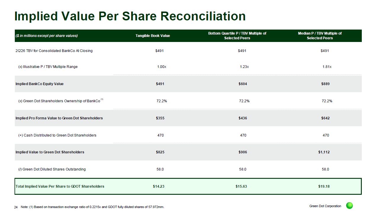 The implied value to shareholders of Green Dot is estimated to be